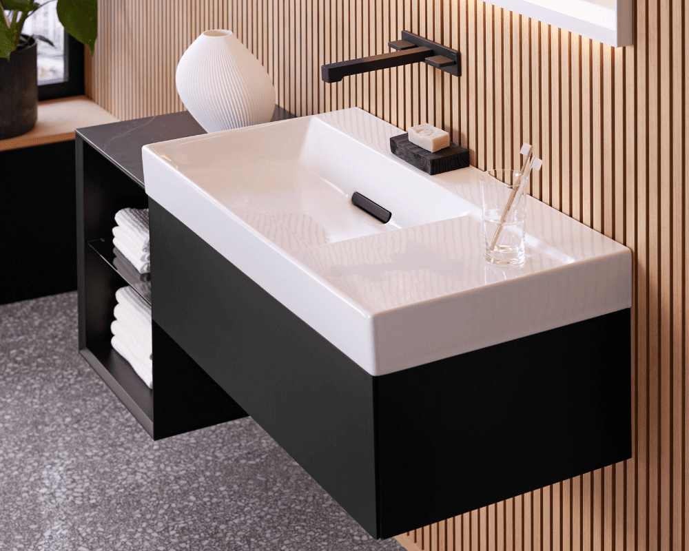 Die berührungslose Armatur Geberit Brenta - hier als Standarmatur in schwarz matt