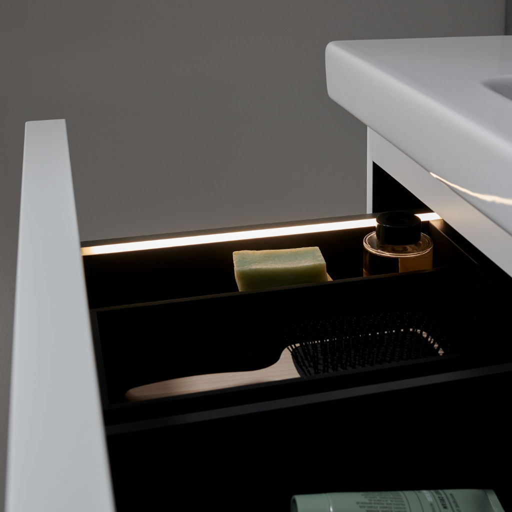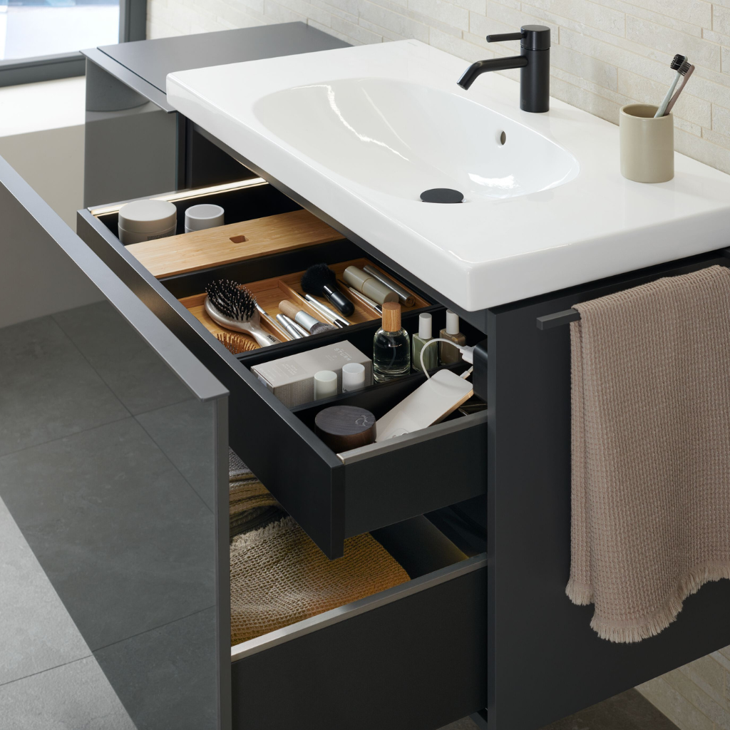 Edle Oberflächen, klare Formen und vielfältige Elemente, die perfekt zur Geberit Badkeramik passen. Die Möbel sind in vielen Farben, Strukturen und Materialien erhältlich - von matt oder hochglänzend lackiert bis zu Melamin-Holzstrukturen. Besonders exklusiv präsentieren sich die Echtglas-Fronten der Serie Geberit Acanto. Alle Serien setzen auch feuchtigkeitsbeständige, pflegeleichte Materialien sowie langlebige Auszüge und Scharniere. Neben Waschtischunterschränken für große Bäder und Gäste-WCs sowie Waschtischplatten bietet das Sortiment auch vielseitige Seiten- und Hochschränke. Clevere Details wie Waschtischunterschränke ohne Unterbrechung durch einen Siphonausschnitt schaffen maximalen Stauraum. Ergänzendes Zubehör wie Ordnungsboxen oder Schubladenbeleuchtung ermöglichen perfekte Ordnung - für ein Bad, das sowohl funktional als auch stilvoll ist.